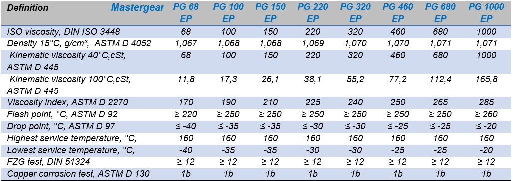 Mastergear PG … EP series are specially selected polyalkylene glycol (PAG) type synthetic base oils with formulation of special additives. It shows outstanding performance even under the most demanding operating conditions, especially the durability is higher than to mineral oils or other synthetic oils. It is used in all production machines, conveyor systems and large-scale gear systems in difficult conditions in industry. Also recommended for centralized lubrication systems of weaving machines. It is not compatible with other mineral-based and synthetic oils. Making sure that the system is flushing and cleaning thoroughly when switching from such oils.