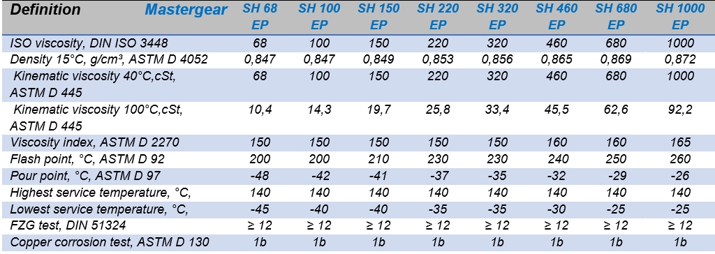 Mastergear SH … EP series are polyalphaolefin (PAO) based fully synthetic gear oils developed with strong additives. Provides trouble-free and safe lubrication in gear systems where high efficiency is expected. Due to its chemical structure, it is known with the definition of synthetic hydrocarbon (SHC). Especially recommended for gear systems with load, vibration and variable temperature parameters. Also recommended for centralized lubrication systems of weaving machines.